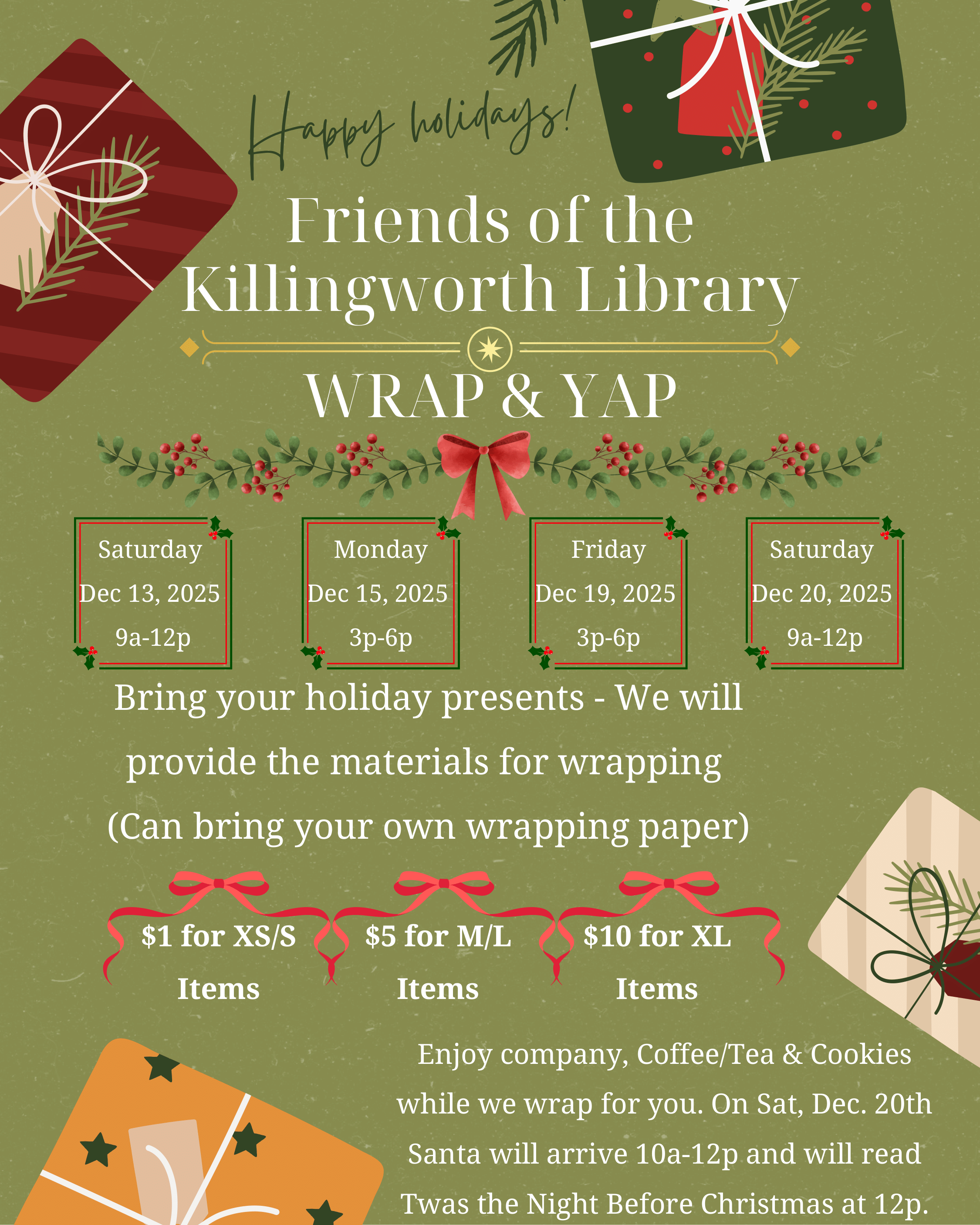 This December, join the Friends of the Killingworth Library for our first Wrap & Yap gift wrapping fundraiser! Bring your holiday presents, and our volunteers will wrap them for you. All wrapping materials will be provided. Enjoy company, coffee/tea, and cookies while you wait!